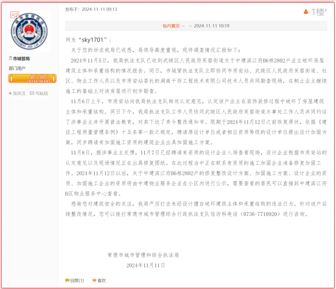 该帖子发布后,常德市城市贬责和概括功令局对帖子所反馈问题进行了回复。