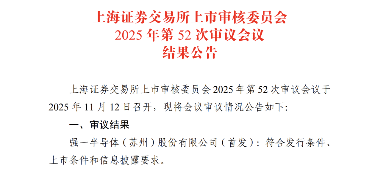 上证报中国证券网讯(钱佳滢 记者 仲茜)11月12日,上海证券往复所上市审核委员会召开2025年第52次审议会议。审议成果清晰,强一半导体(苏州)股份有限公司(以下简称“强一股份”)适应刊行要求、上市要求和信息露馅要求,拟登陆科创板。